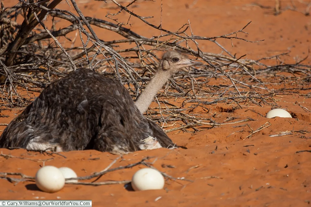 On the morning game drive, we had observed a male ostrich, this afternoon we lucky enough to see a female, laying on a different batch of eggs.